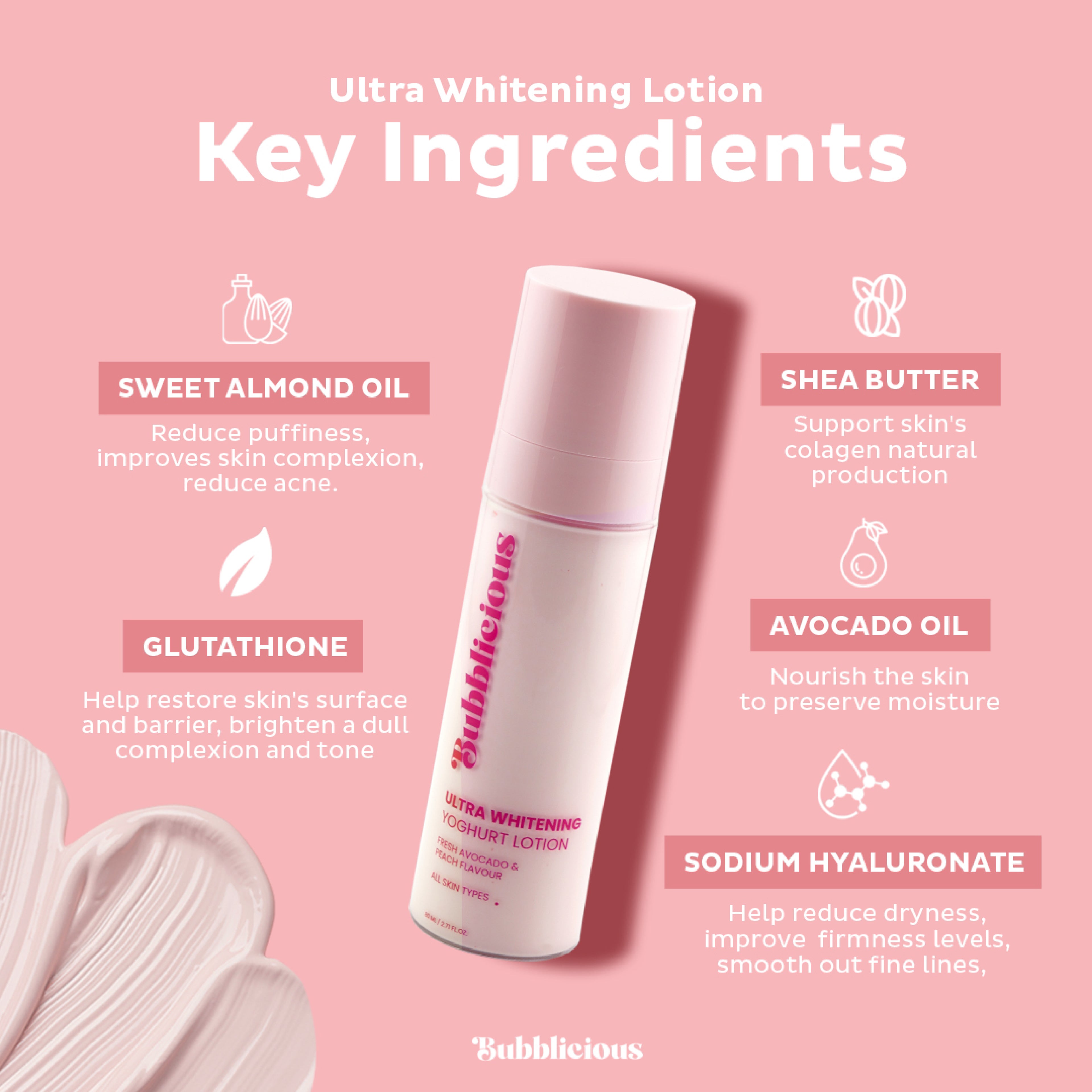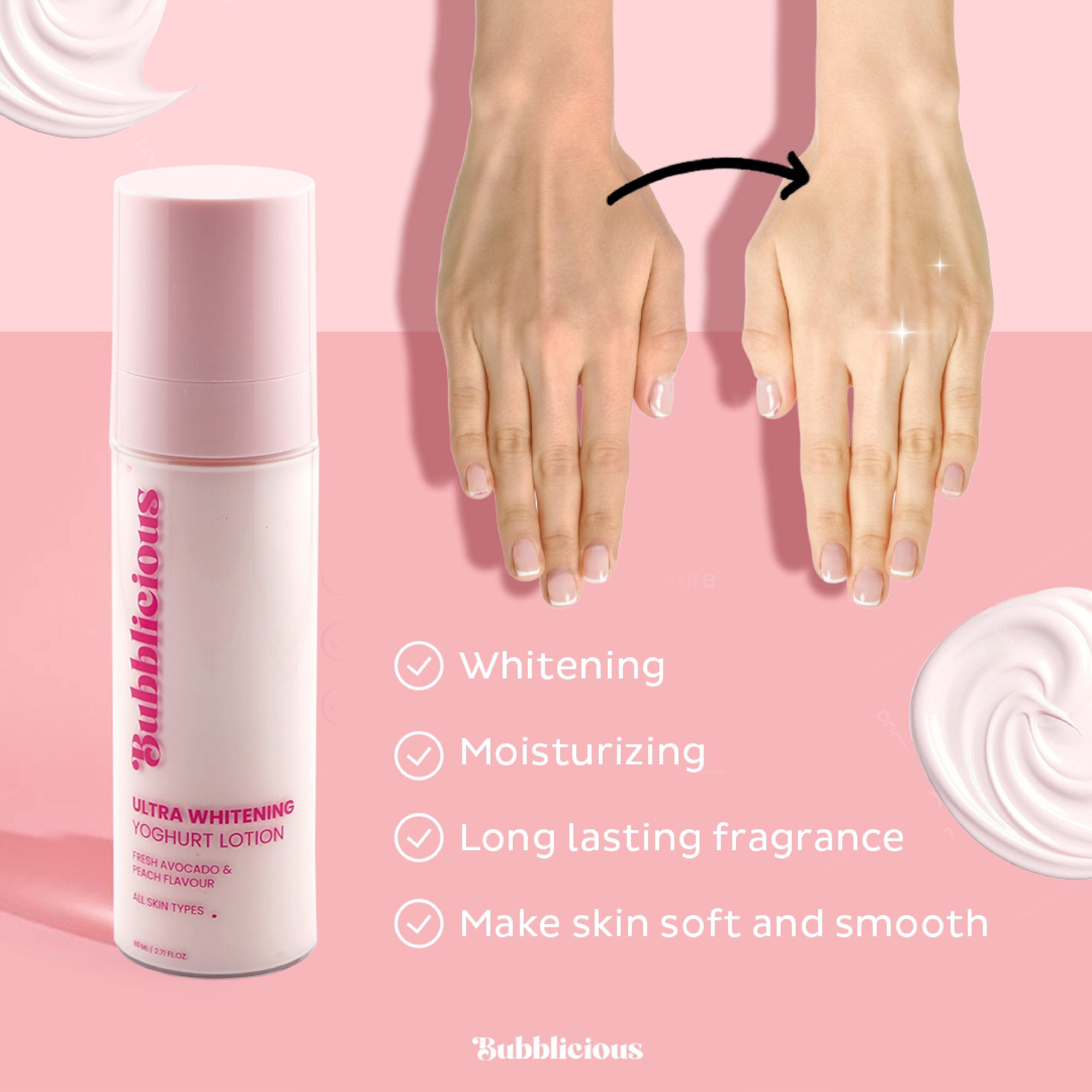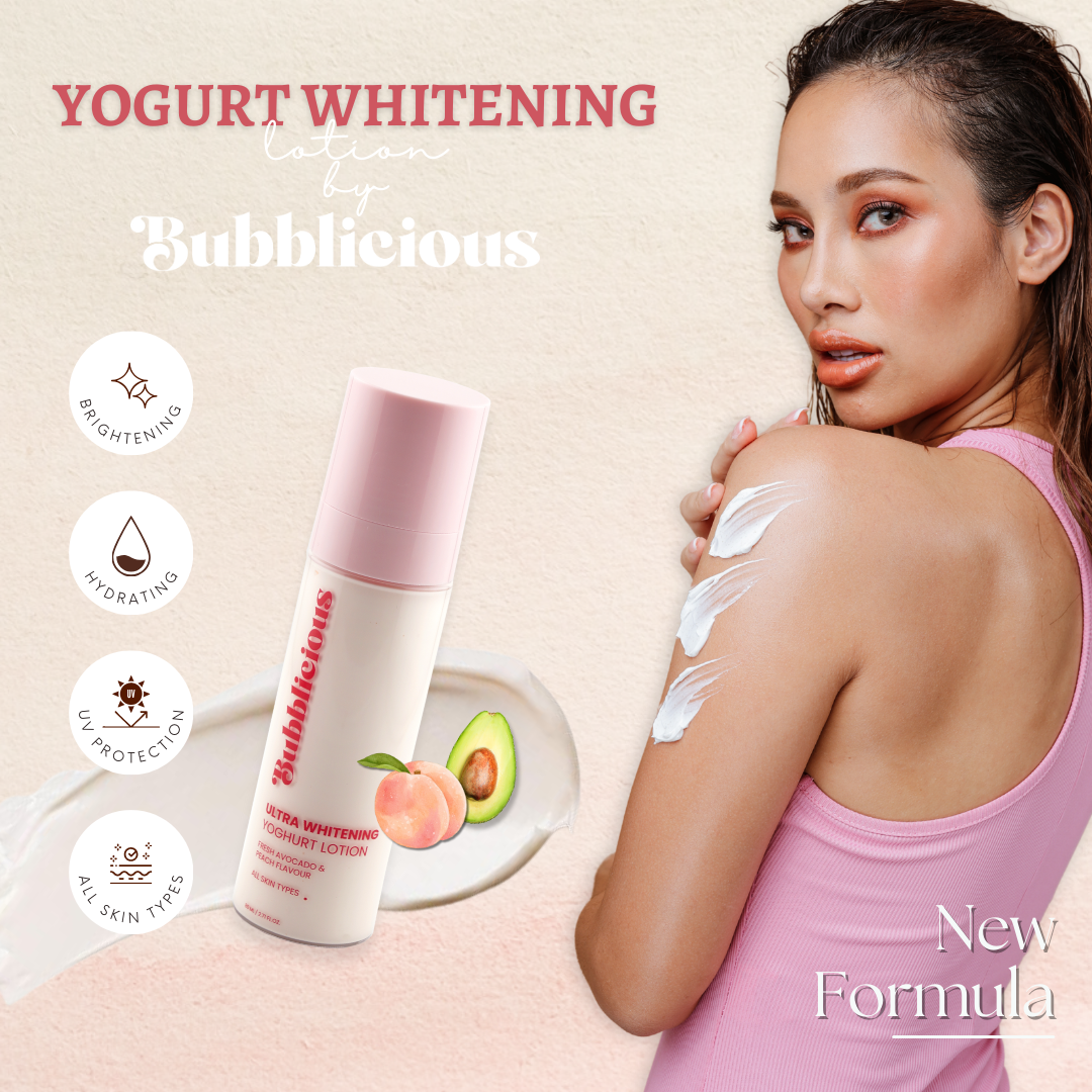Experience the ultimate glow-up with our Yoghurt Whitening Lotion! Specially crafted to brighten up your underarms, groin, body, face, elbows, knees, and ankles, this SPF50-powered formula is your go-to for luminosity. Say goodbye to stickiness – our lotion is easily and fully absorbable, leaving your skin feeling smooth, soft, supple and instant brightening. Indulge in the delightful scent of fresh avocado and peach flavor as you embrace a brighter, radiant you.